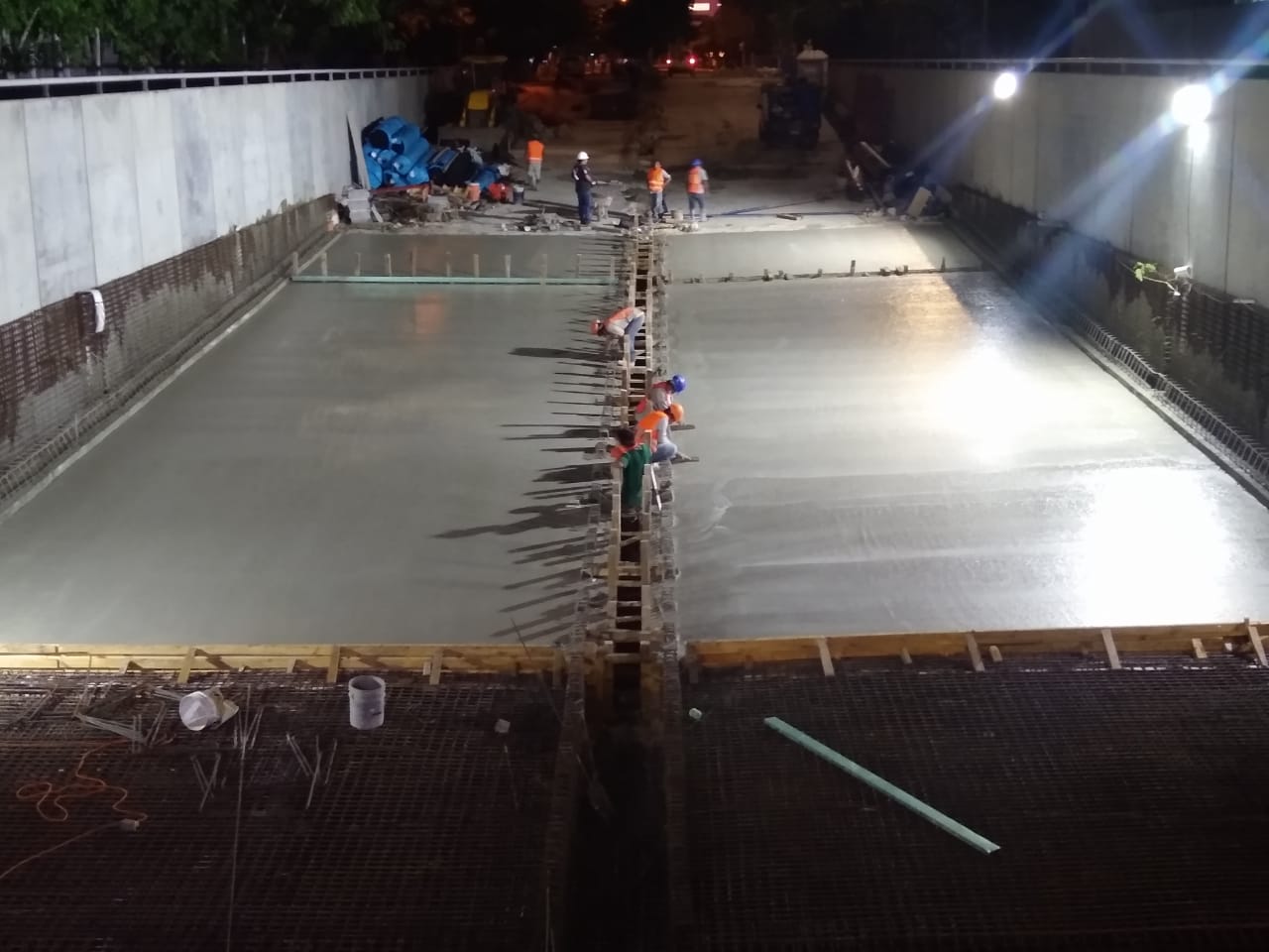 Esta semana se realizó el colado de aproximadamente 420 M2 de la rampa sur con concreto hidráulico de gran resistencia, con lo cual se alcanza la altura de la rampa de rodamiento especificada para el proyecto de rehabilitación del paso a desnivel de la avenida Prolongación Paseo de Montejo.
