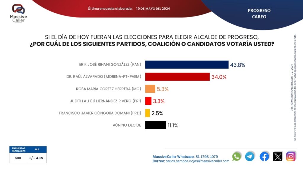 En los recientes resultados de Massive Caller, Erik Rihani González ha logrado otro impresionante avance, consolidando aún más su posición como el claro favorito en la contienda por la alcaldía.