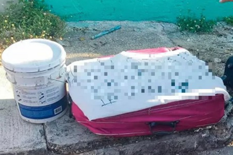 De manera preliminar se informó el hallazgo de un cuerpo sin vida en la calle 8, manzana 58, el cual fue abandonado dentro de una maleta de ropa y a un costado dejaron una cubeta ensangrentada.