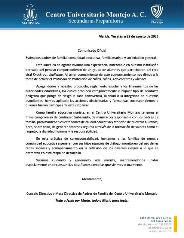 El video que circula muestra a un grupo de jóvenes en los baños del plantel y realizando dicho reto, por lo que la dirección del CUM manifestó su reprobación a tal comportamiento y pidió el trabajo conjunto con los padres de familia para reforzar la seguridad del alumnado. Aunque no se informó en qué consiste la sanción que recibieron los participantes en tal “prueba” el plantel  informó mediante oficio que ya se han tomado las medidas respectivas.
