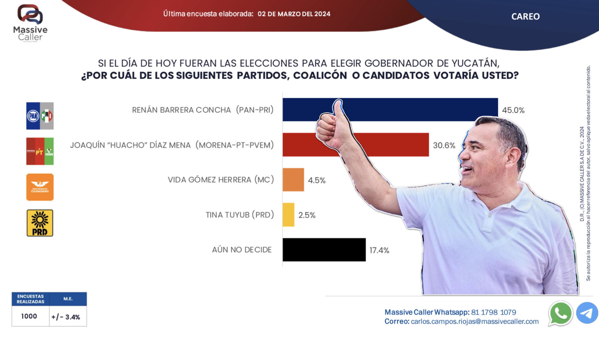Con estos resultados, Renán Barrera Concha se posiciona como el claro favorito en la contienda electoral para la gubernatura de Yucatán, mientras que su competencia busca revertir la tendencia en las próximas semanas de campaña.