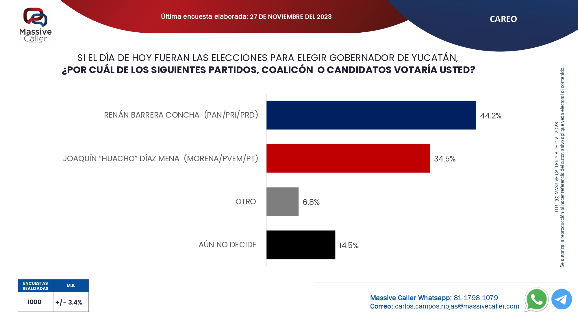 Una reciente encuesta realizada por Massive Caller ha revelado un incremento significativo en el margen de votantes que favorecerían a Renán Barrera Concha como el próximo Gobernador del estado de Yucatán. La encuesta planteó la pregunta crucial: «Si hoy fueran las elecciones para elegir gobernador, ¿por cuál de los siguientes partidos, coaliciones o candidatos votaría usted?».