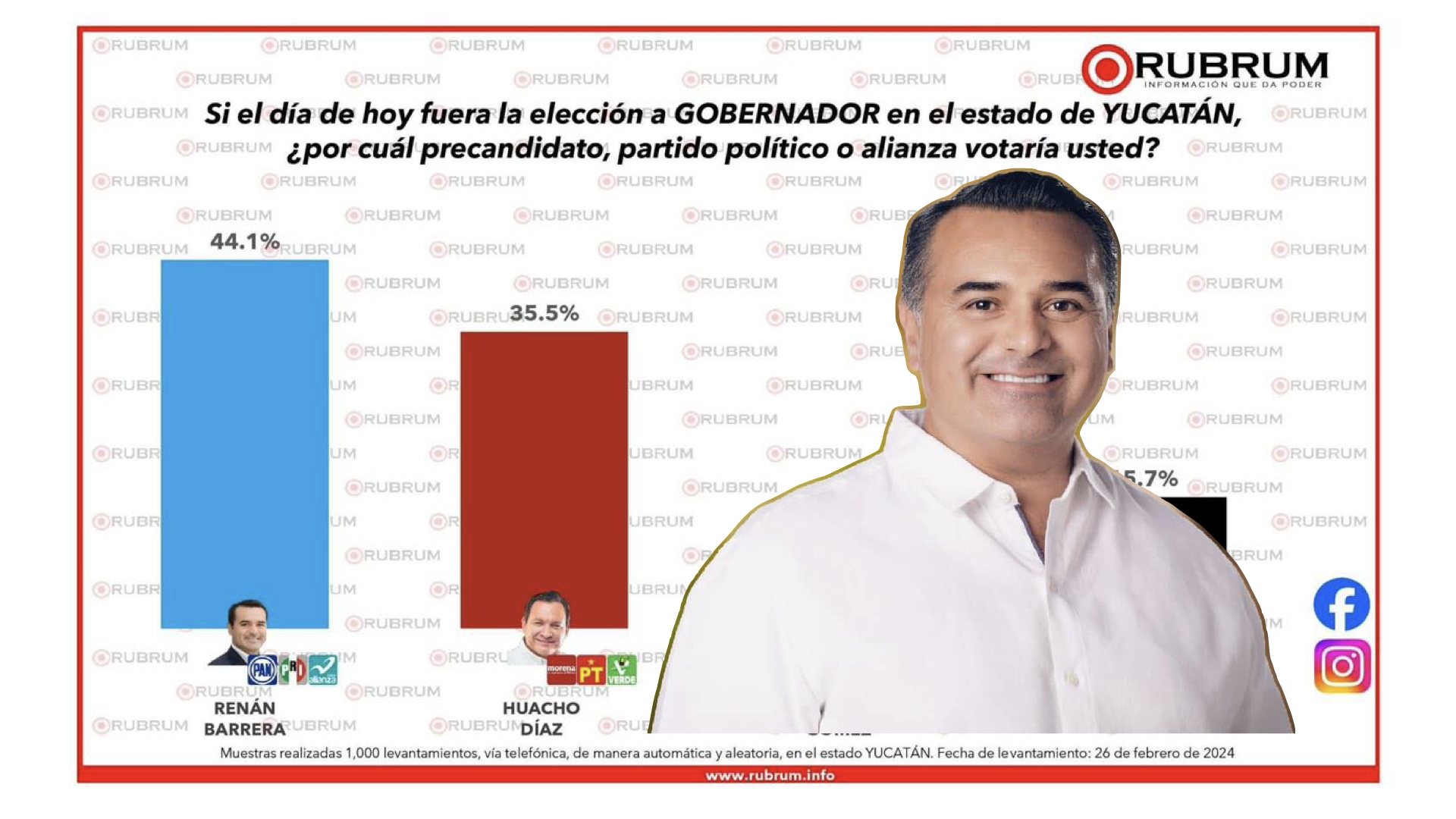 Según la última encuesta realizada por la Encuestadora Rubrum, Renán Barrera Concha, candidato de la coalición PAN-PRI-Nueva Alianza, lidera la preferencia electoral rumbo a la gubernatura de Yucatán, a tan solo tres días de que inicie la campaña el próximo 1 de marzo.