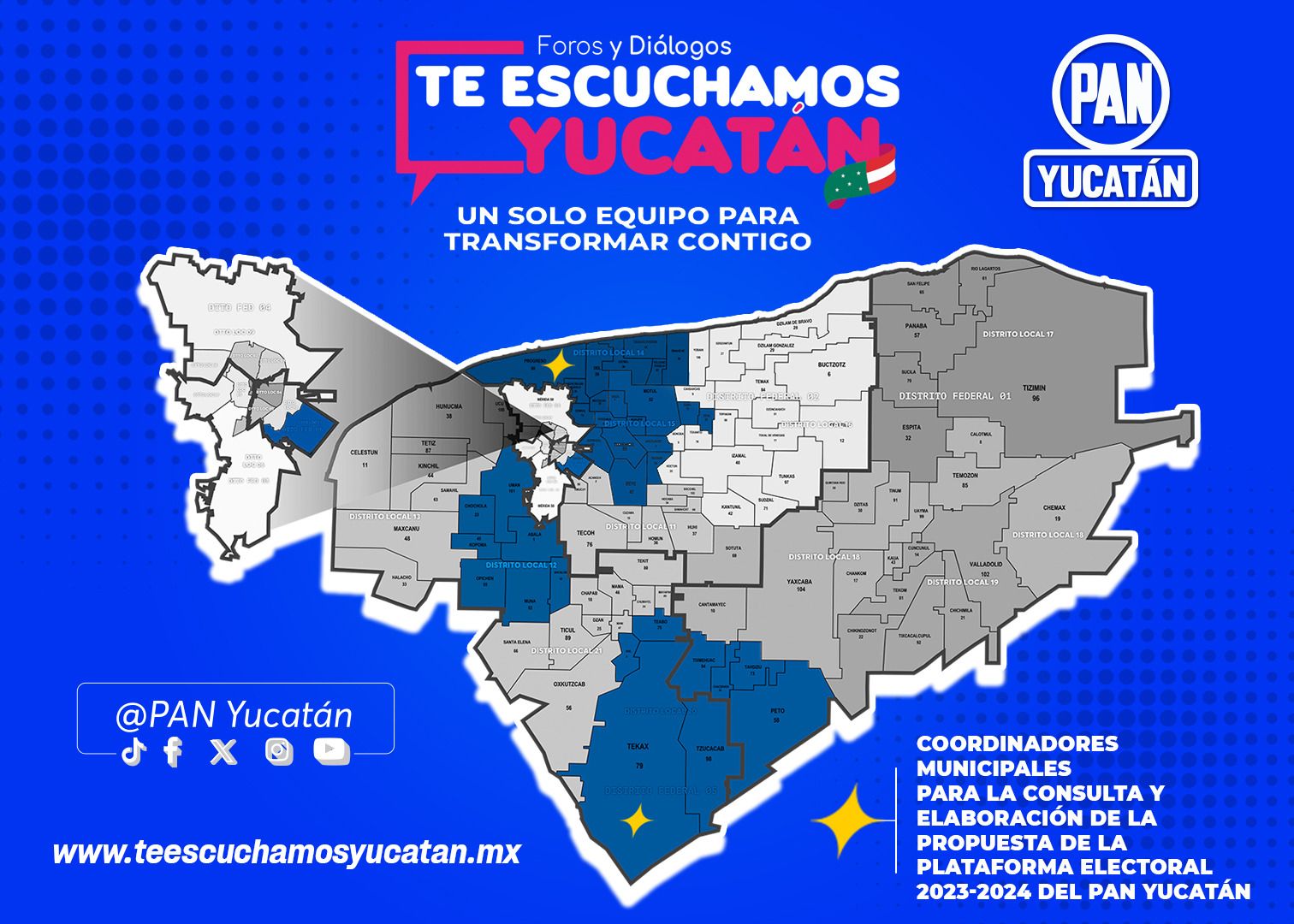 El Partido Acción Nacional (PAN) de Yucatán se encuentra en pleno proceso de escuchar y comprometerse con la voz de los yucatecos, a medida que elabora su plataforma política de cara a las elecciones del 2024. Bajo la iniciativa «Te Escuchamos Yucatán», el PAN ha emprendido una serie de foros en diferentes municipios y ha lanzado el micrositio teescuchamosyucatan.mx, con el objetivo de unir esfuerzos en la construcción de un Yucatán mejor para el futuro.
